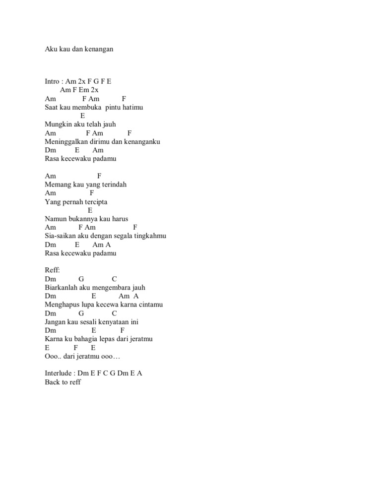 Am 2x f g f e. Karaoke aku kau dan kenanganku,kunci gitar aku kau dan kenanganku,kunci gitar lagu aku kau dan kenanganku, Mari support para artis dengan streaming lagu mereka melalui gerai digital dan membeli produk mereka berupa kaset/cd dan lainnya. We don't upload second civil aku kau dan kenanganku lyrics, we just retail information from other sources & hyperlink to them.when there is a damaged backlink we're not in control of it. F fm c dm f c f dm setiap malam saat kau tak ada em am hanya sepi yang ku rasa f dm kuberharap dirimu ada em am menemani aku yang hampa f fm malam ini. Meninggalkan dirimu dan kenanganku dm e am rasa kecewaku padamu. Em c em c meninggalkan dirimu dan kenanganku. Am b em rasa kecewaku padamu intro: Kunci gitar second civil_ aku, kau, dan kenanganku request #erlanzaslanz intro : Am 2x f g f e am f em 2x am f am f saat kau membuka pintu hatimu e mungkin aku telah jauh.